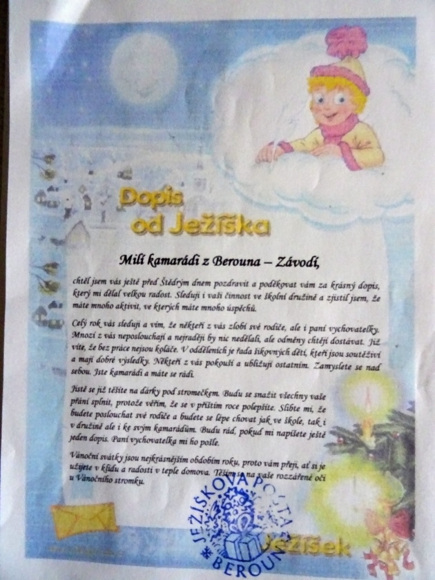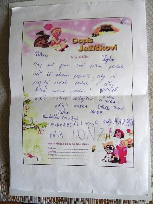 Během prosince probíhalo v odděleních družiny psaní dopisu Ježíškovi. Dopis byl doplněn i různými obrázky, které zachycovaly, co bychom svým známým přáli, aby dostali od Ježíška pod stromeček. Uvidíme, až se v lednu vrátíme zpět a budeme si povídat o Vánocích, zda se naše přání splnila. Dopis jsme pak odevzdali svým vychovatelkám a ty je zaslaly Ježíškovi. A nyní již začalo netrpělivé čekání, zda náš dopis se k Ježíškovi dostal a zda nám na něj odpoví. Dlouhé chvíle čekání a pořád se nic nedělo. Dočkáme se? Uvidíme! Asi toho má mnoho a my stále čekáme a čekáme.