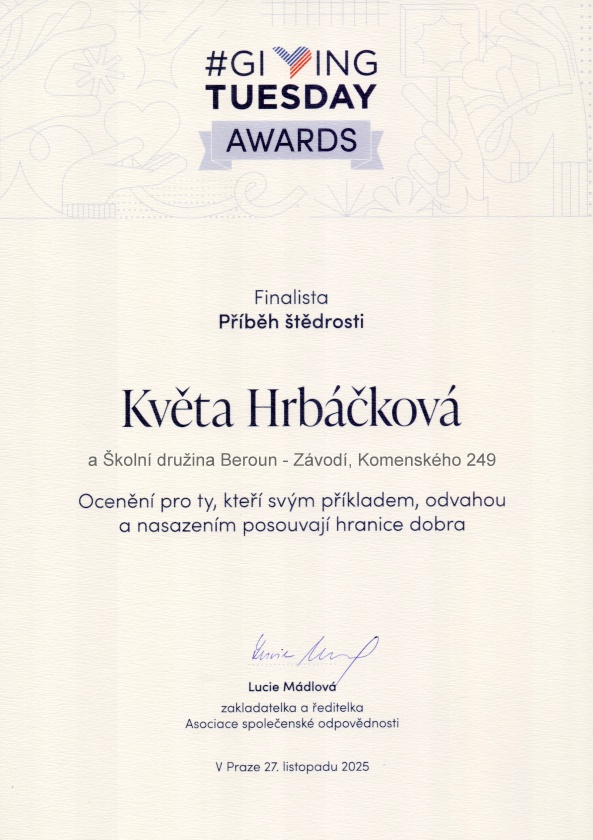 Giving Tuesday pronikl i do naší školní družiny, a to již v roce 2018. Jde o celosvětové hnutí štědrosti a dobrých skutků, které vzniklo v roce 2012 v USA. Slaví se každoročně v úterý po Dni díkůvzdání. V Česku ho již desátým rokem zastřešuje Asociace společenské odpovědnosti jako národní ambasador. V tento den se stovky milionů lidí napříč všemi kontinenty spojí, aby inspirovaly ke štědrosti a konaly dobro.
