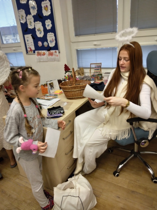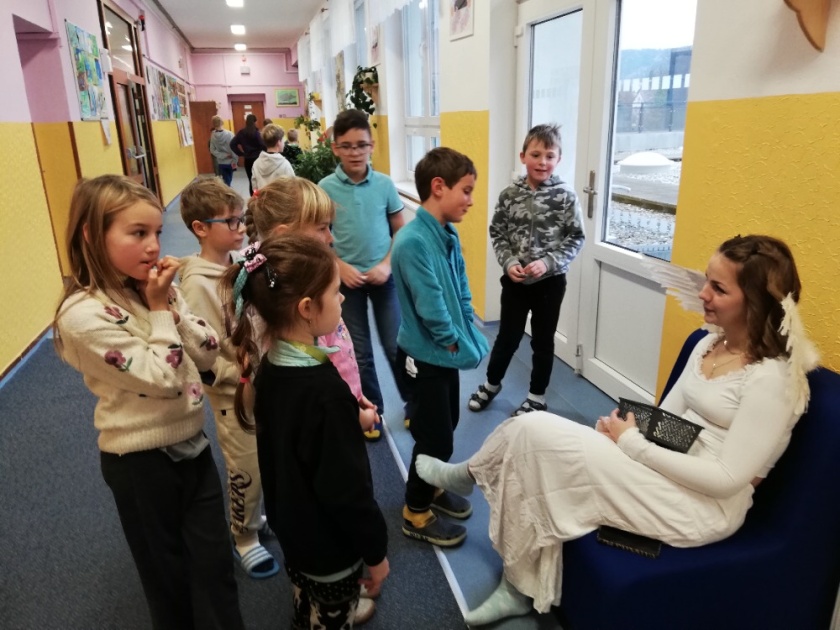 Stanoviště ANDĚL – zde jsme si zazpívali koledy. Anděl dětem vysvětlil, že zpěv přináší klid a radost.