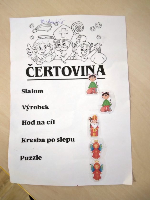 Do 4. a 2. oddělení přišla také celá svatá rodina – čerti, Mikuláš a anděl. Společně jsme si připomenuli tradiční postavy Mikuláše, anděla a čerta a pobesedovali o nich. Jaké mají vlastnosti, co symbolizují a proč za námi chodí. Potom jim praktikantky přiblížily svá stanoviště, seznámily je s úkoly, které zde budou plnit. Body za soutěže jsme zapisovaly do startovní karty ČERTOVINY. A jaká byla stanoviště?
