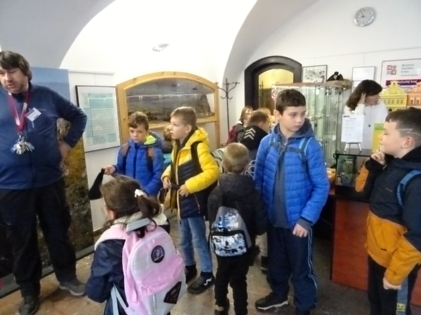 Scházíme se v osm hodin u školy. Vzhledem k tomu, že je velká zima, jdeme na chvíli do školy, kde se připomeneme, co nás dnes čeká. Než jsme odešli, připomenuli si historii Berouna, ale především se věnovali pověstem a legendám. Připomenuli jsme si skřítka Klepáčka, Bílou paní, která se vztahuje k Jenštejnskému domu. Potom již odcházíme na akci v Muzeu Českého krasu, kde na nás již čeká průvodce a geolog pan Pavel Bokr. Rozdělujeme se na dvě skupiny. Jedna se s geologem bude věnovat zdejší výstavě Český kras a druhá půjde rýžovat minerály, ze kterých bude vyrábět šperky dle vlastního výběru. Po určité době se vyměníme, a budeme pokračovat v další činnosti.