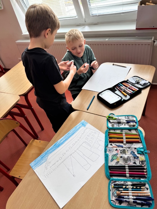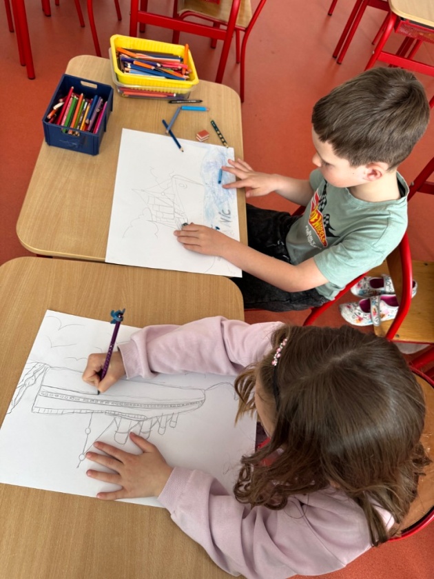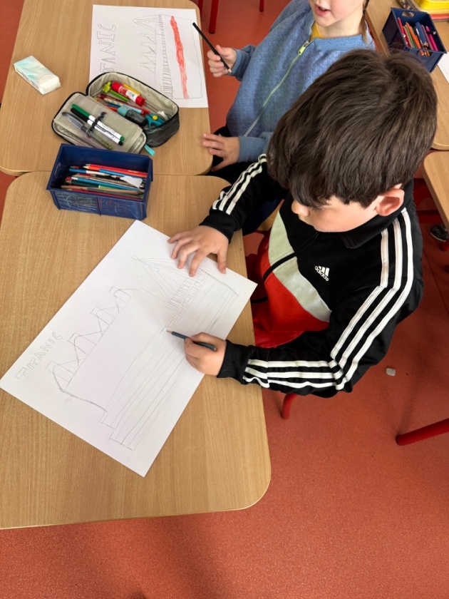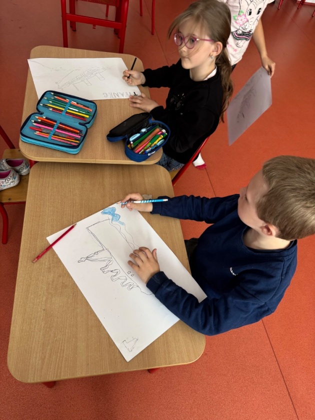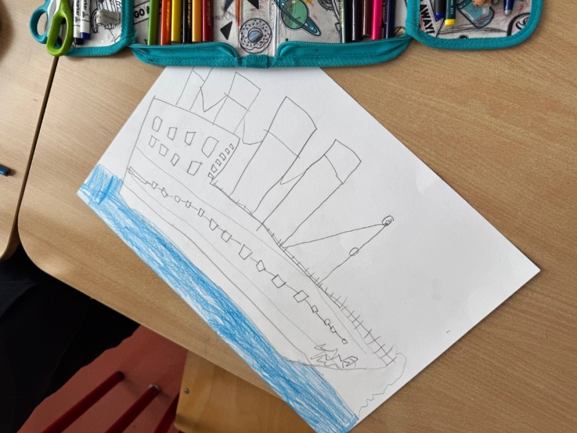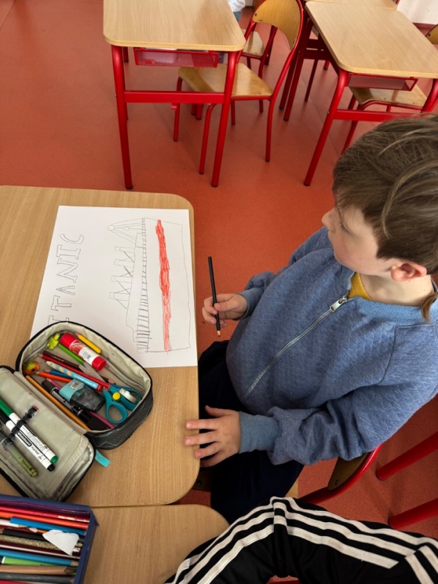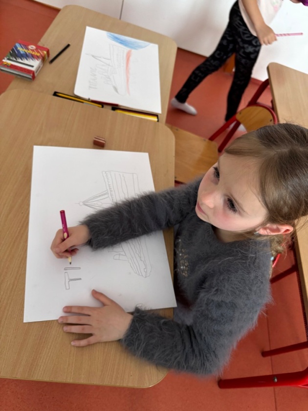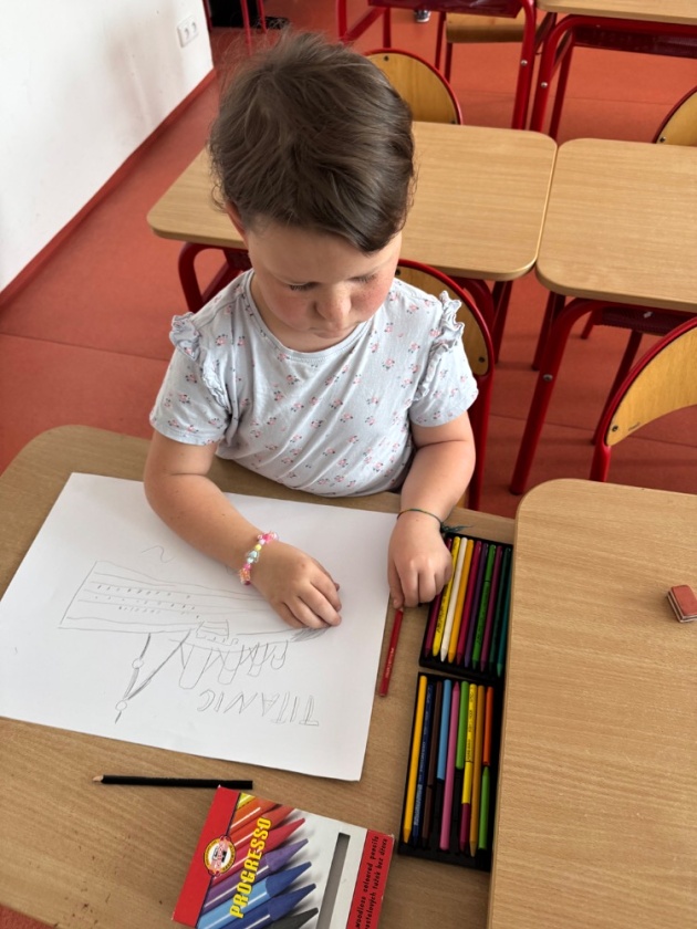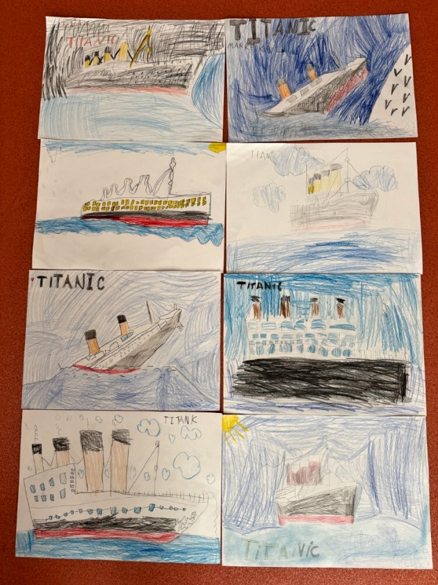 Ve středu 15. dubna se děti z tohoto oddělení po obědě shromažďují ve své družině. Čeká je zajímavé odpoledne. Připomínají si dnes výročí tragické události, potopení Titaniku. Zpočátku jsme si s dětmi povídali o tom, jak se všechno událo. Připomenuli jsme si i různé zajímavosti. Do besedy se zapojily i samotné děti. I ony toho vědí docela dost. Potom jsme si pouštěli simulaci tragédie a videa vraku na dně Atlantského oceánu. Ve druhé části odpoledne děti namalovaly krásné obrázky Titaniku, ze kterých jsme si udělali nástěnku.