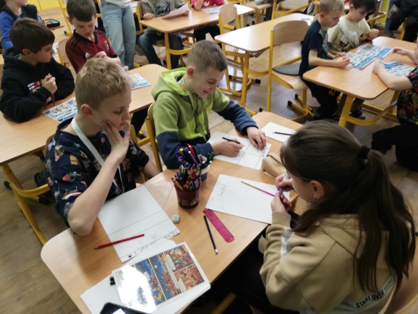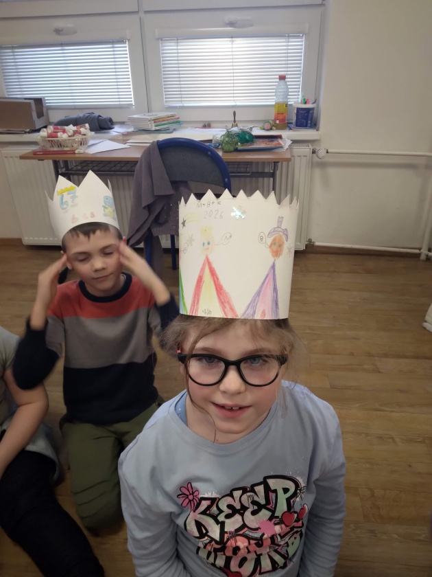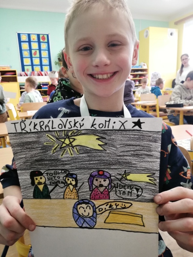 Ne jinak tomu bylo i v další skupině, kde se děti seznámily s příběhem Tří králů. Zopakovali jsme si naše informace o dnešním dnu, o Třech králích. Vysvětlili jsme si význam nápisu K + M + B (nebo C + M + B). v další části našeho odpoledne jsme si vyrobili královskou korunu a vyzdobili ji. V závěru našeho odpoledne jsme každý z nás vymyslel komiks. Do čtyř okének jsme nakreslili příběh Tří králů. Když bylo hotovo, každý se se svým uměním pochlubil.