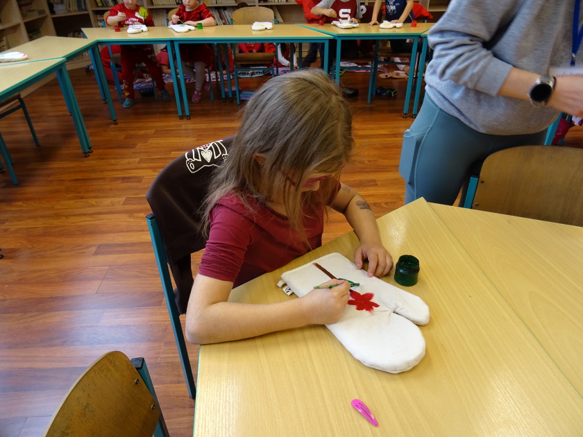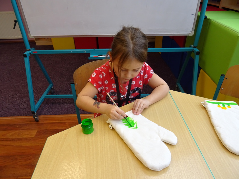 Krátce po poledni přijíždí do družiny paní Eliška Dolejš, aby s námi strávila dnešní odpoledne. Přiváží všechny potřebné věci k výrobě a odchází do naší literární dílny, kde se během odpoledne vystřídají všechna oddělení. Jejich úkolem bude výroba chňapky s vlastním námětem. Ve 13 hodin nastupuje jedna skupina. Postupně se všichni prostřídáme. Paní Eliška nám nejprve vysvětlí, co bude naším úkolem, jak budeme pracovat, ale i jaké barvy a jak budeme používat. Posléze rozdá chňapky a my jdeme na věc. Každá chňapka jiná a jiný motiv. To je paráda. Postupně se všichni vystřídáme, chňapky necháme uschnout a další den si je rozdělíme. Odpoledne uteklo velice rychle a my máme hotovo.
