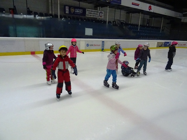 Během měsíce září jsme dávali dohromady první zimní sportování. Již několik let děti naší školní družiny v měsíci říjnu začínají první zimní sporty. V rámci VSA se pravidelně dvakrát do měsíce zúčastňují „Bruslařské školy“, která je provozována na zimním stadionu v Berouně. Je 12,40 hod. a my odcházíme s paní vychovatelkami na zimní stadion. Dorazili jsme na stadion, jdeme do šaten a převlékáme se do sportovního. Nazouváme brusle a jdeme na kluziště. Ještě předem proběhlo poučení o bezpečnosti při bruslení a připomenutí si, co nesmíme, aby nedošlo k žádnému úrazu.